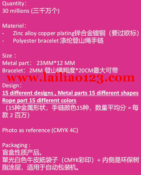 有硬实力的工厂来,非工厂勿扰,3000万个手链,15种款式,每种200万个。