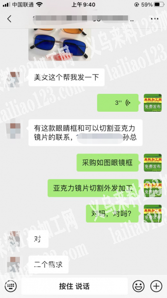 老板委托寻找:眼睛框采购,和切割外发,有这款眼睛框和可以切割亚克力镜片的联系,孙总